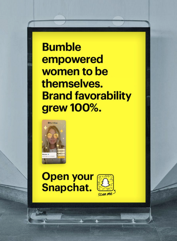 Open Your Snapchat’s B2B leg ran from fall 2021 through spring 2022 in the US, the UK, Canada, the UAE, KSA, France, Germany, Sweden, Norway, Australia, and the Netherlands, and featured partners like Verizon, Bumble, Pampers, adidas, Pringles, H&M Beauty, Oatly, Vans, Tommy Jeans, Samsung, Volkswagen, and many more. The campaign showed up OOH on billboards, on bus shelters, in subway stations, organically on social (LinkedIn and Twitter), in paid media (homepage takeovers, Youtube pre-roll animations, etc.), and in print, and was activated on the ground during Advertising Week New York in 2021.