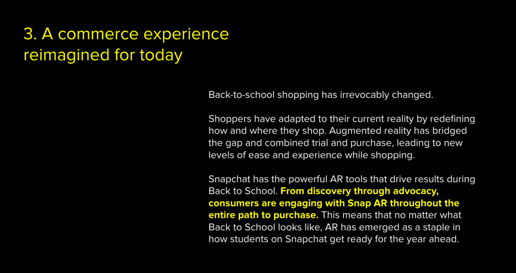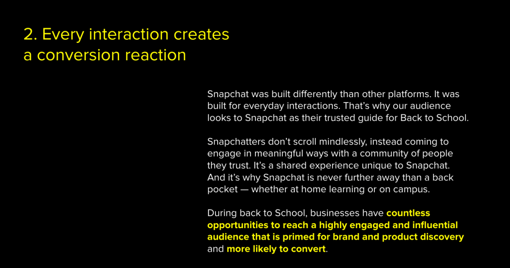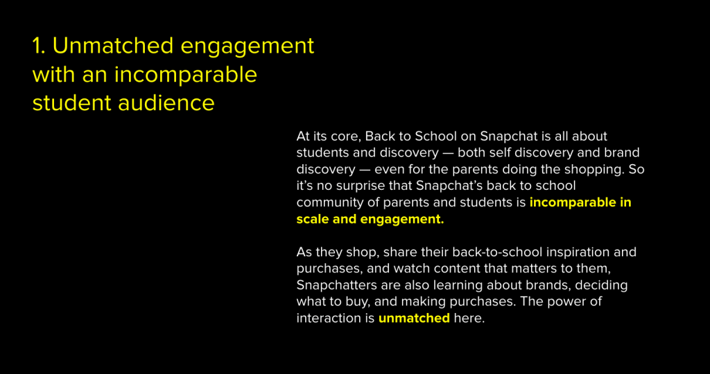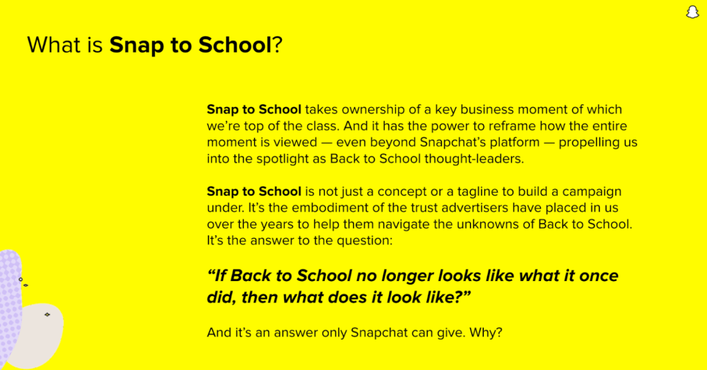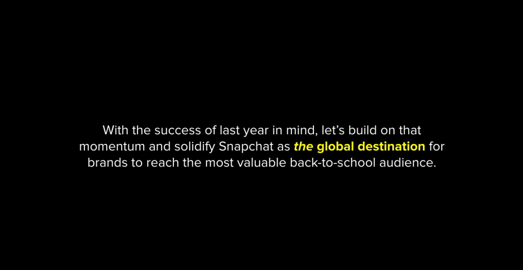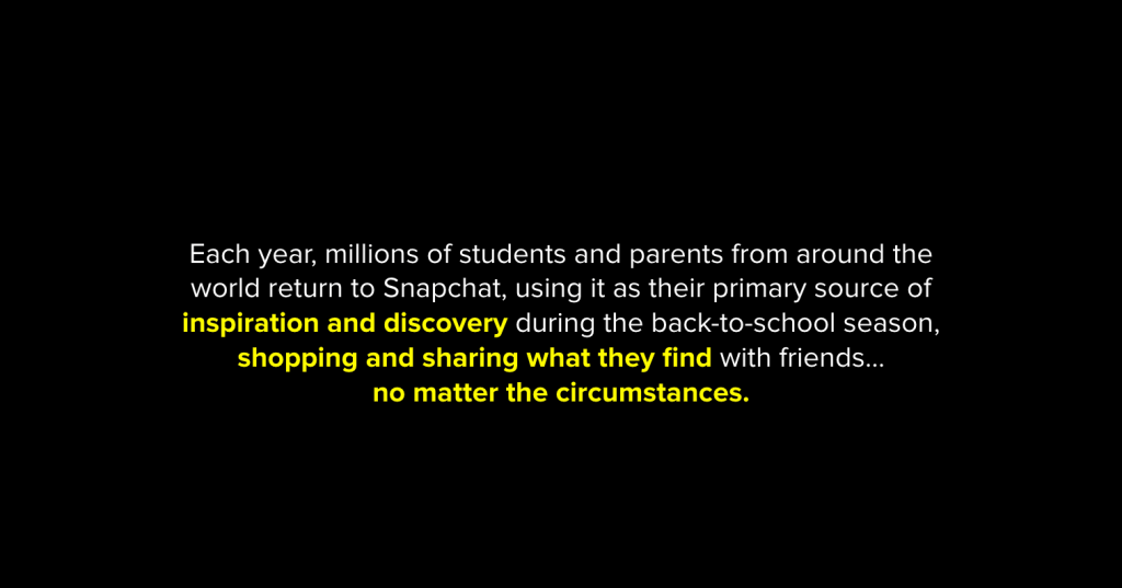 I worked with the lead marketer and took Snapchat’s key B2S insights and breathed life into them, which helped to solidify Snapchat’s place at top of the class in the back-to-school ecosystem.